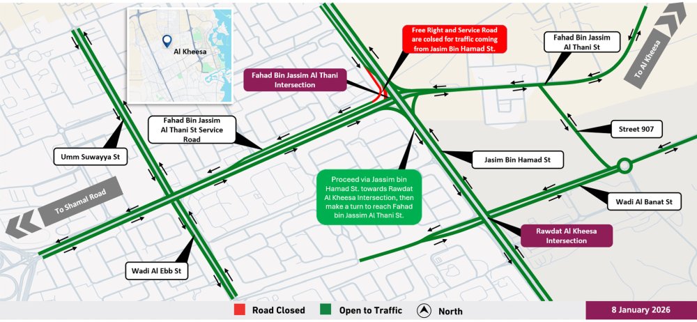 ജാസിം ബിൻ ഹമദ് സ്ട്രീറ്റിൽ നിന്ന് ഫഹദ് ബിൻ ജാസിം അൽ താനി സ്ട്രീറ്റിലേക്ക് പോകുന്ന വാഹനങ്ങൾക്കുള്ള സർവീസ് റോഡ് 2026 ജനുവരി 12 മുതൽ താത്‌കാലികമായി അടച്ചിടുമെന്നാണ് അധികൃതർ അറിയിച്ചിരിക്കുന്നത്. ഇവിടെയുള്ള ഫ്രീ റൈറ്റും താത്കാലികമായി അടച്ചിടുന്നതാണ്.