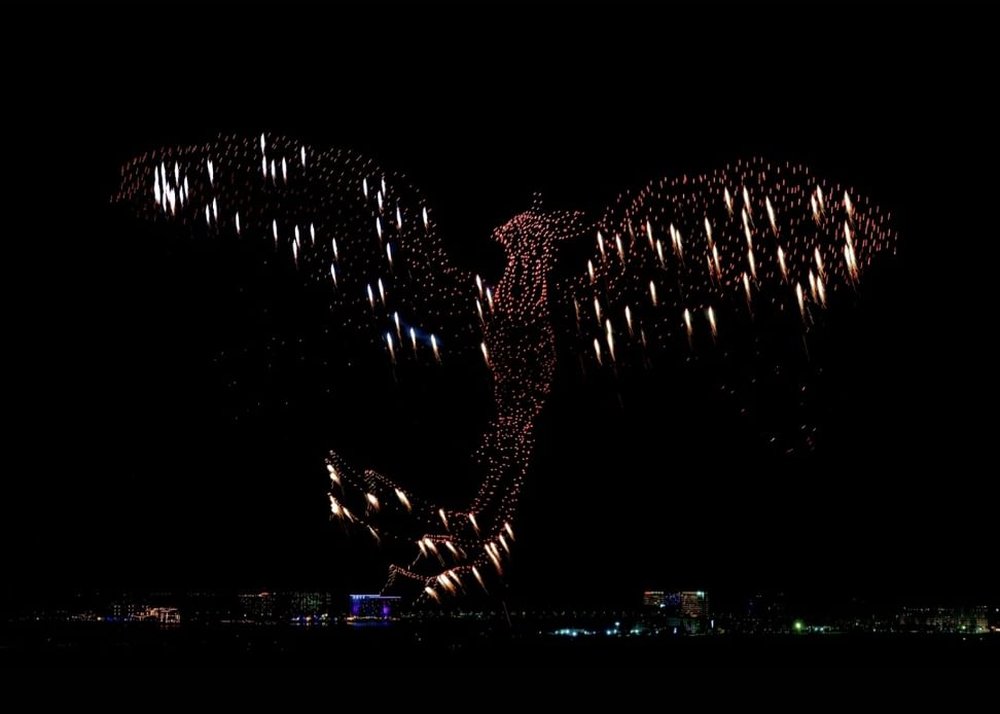 പയ്റോ ഡ്രോണുകൾ, ലേസർ ഡ്രോണുകൾ എന്നിവ ഉൾപ്പടെ 2300-ലധികം ഡ്രോണുകൾ ഉപയോഗിച്ചാണ് ഈ ഫീനിക്സ് രൂപം റാസൽഖൈമയുടെ വാനിൽ തീർത്തത്. 1000 പയ്റോ ഡ്രോണുകൾ തീജ്വാലയിൽ തിളങ്ങുന്ന രീതിയിലുള്ള ഫീനിക്സ് പക്ഷിയുടെ ചിറകുകൾക്ക് രൂപം നൽകി.