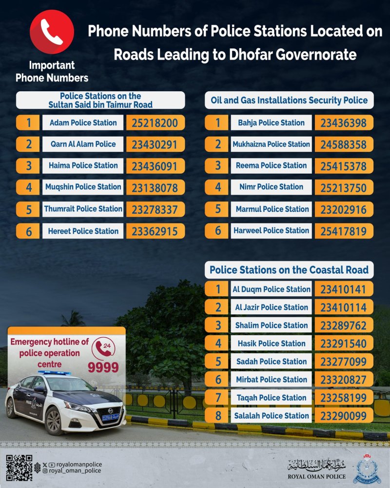 ദോഫാർ ഗവർണറേറ്റിലേക്കുള്ള പാതകളിൽ സ്ഥിതിചെയ്യുന്ന വിവിധ ROP ചെക്ക്പോയിന്റുകളുടെ അഡ്രസ്സ്, ബന്ധപ്പെടാനുള്ള ഫോൺ നമ്പർ എന്നിവ കൈവശം കരുതുന്നത് അടിയന്തിര ഘട്ടങ്ങളിൽ യാത്രികർക്ക് ഏറെ സഹായകരമാകുമെന്ന് പോലീസ് കൂട്ടിച്ചേർത്തു.