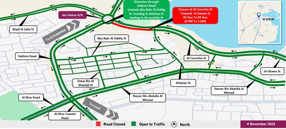 ഈ അറിയിപ്പ് പ്രകാരം 2025 നവംബർ 6, വ്യാഴാഴ്ച രാത്രി 9 മണി മുതൽ കോർണിഷ് സ്ട്രീറ്റിലെ ഒരു മേഖല സമ്പൂർണ്ണമായി അടച്ചിടുന്നതാണ്. 2025 നവംബർ 9, ഞായറാഴ്ച രാവിലെ 5 മണി വരെയാണ് ഈ നിയന്ത്രണം.