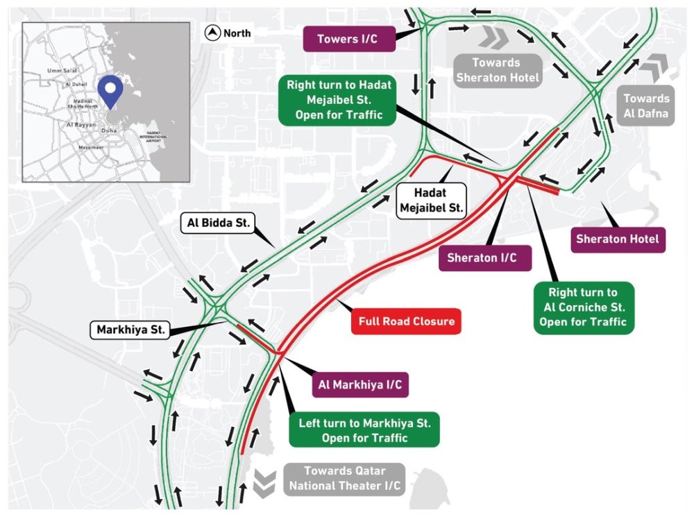 ഈ വാരാന്ത്യത്തിൽ കോർണിഷ് സ്ട്രീറ്റിൽ താത്കാലിക ഗതാഗത നിയന്ത്രണം ഏർപ്പെടുത്തുമെന്ന് ഖത്തർ പബ്ലിക് വർക്സ് അതോറിറ്റി അറിയിച്ചു. 2025 ഒക്ടോബർ 28-നാണ് അതോറിറ്റി ഇത് സംബന്ധിച്ച അറിയിപ്പ് നൽകിയത്.