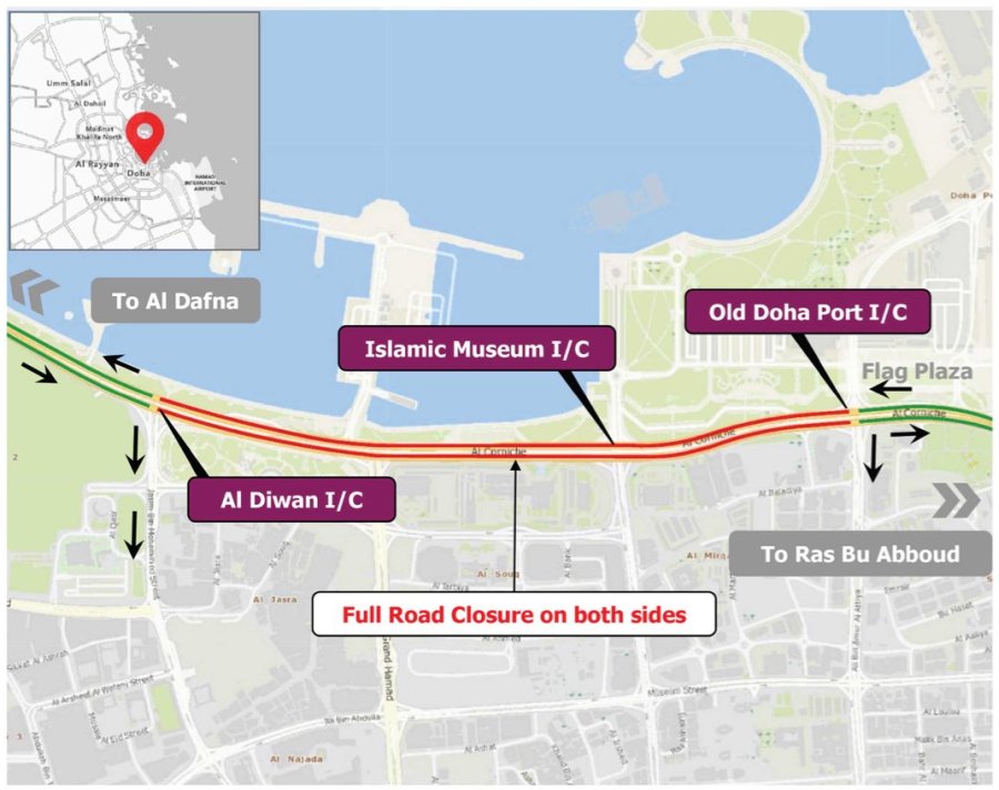 ഈ വാരാന്ത്യത്തിൽ കോർണിഷ് സ്ട്രീറ്റിൽ താത്കാലിക ഗതാഗത നിയന്ത്രണം ഏർപ്പെടുത്തുമെന്ന് ഖത്തർ പബ്ലിക് വർക്സ് അതോറിറ്റി അറിയിച്ചു. 2025 ഒക്ടോബർ 6-നാണ് അതോറിറ്റി ഇത് സംബന്ധിച്ച അറിയിപ്പ് നൽകിയത്.